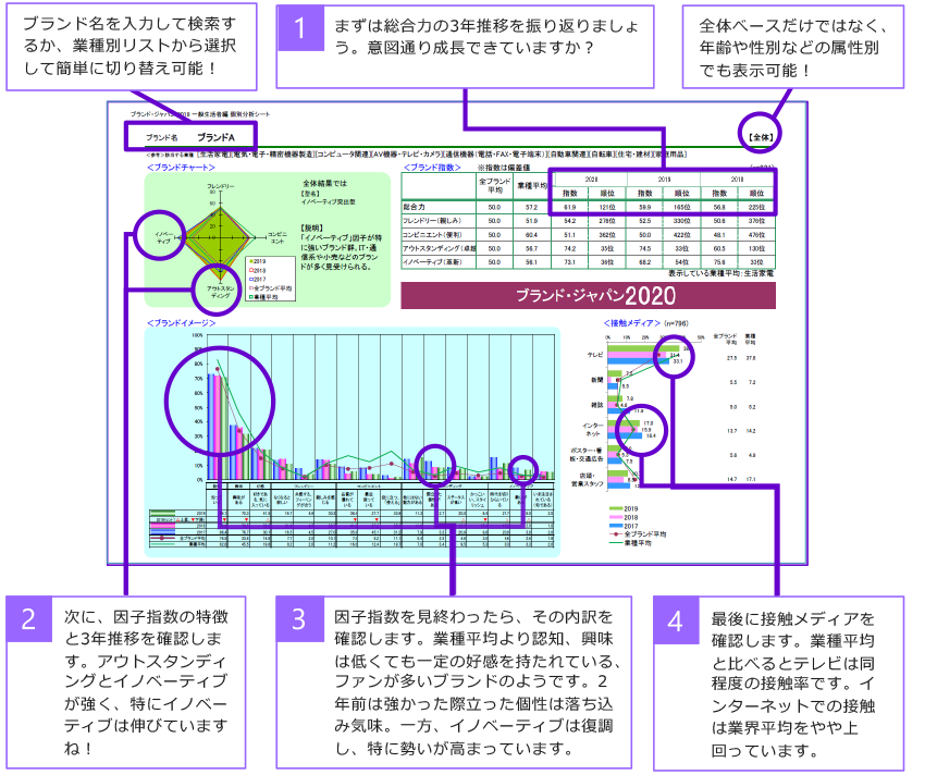 自社ブランドの現状を一枚で確認できるのがこのシート。すべての分析はここからスタートします。過去3年分の結果を見ながら、変化のトレンドを掴むことが大切です。各因子指数の強さとバランスを同時に把握できるレーダーチャートは、目には見えないブランドの“形”を端的に確認できるツールです。