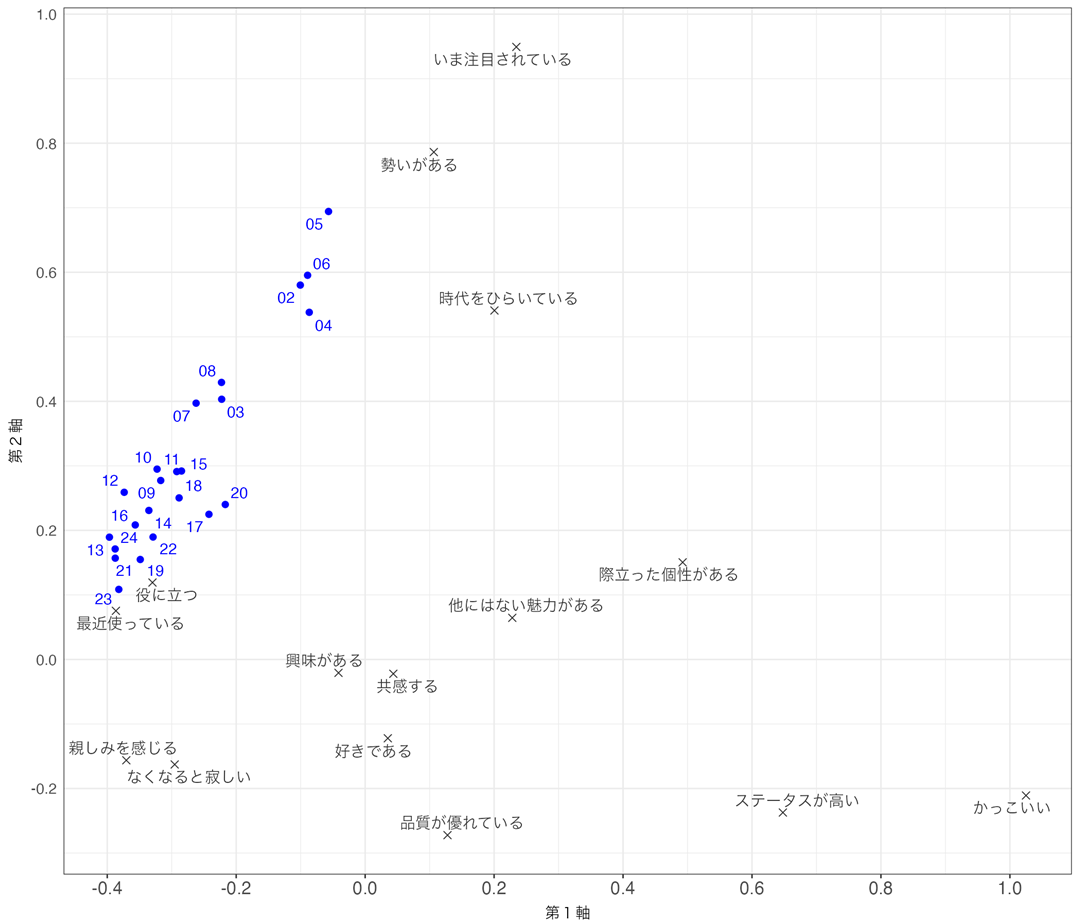 そのようなイメージの質的側面を表すのが、図1に示したようなイメージ空間である。これは、「YAHOO!」を対象とした23回分のデータを対象とし、コレスポンデンス分析(=双対尺度法)を用いて作成した。データから計算したイメージ項目どうしの対応の深さ(色の似具合)を、空間上の距離に置き換えてある。つまり位置の近い項目ほど、同系色=意味が似ている、と読める。図1からは、中央・上方にはイノベーティブ因子、右・下方にはアウトスタンディング因子、やや左下・原点付近にはフレンドリー因子、そして、それを取り囲むようにコンビニエント因子を構成するような項目群が配置されていることがわかる。空間の各部分が、それぞれの色=意味に染まっていると見てよい。空間の構成は、ブランド・ジャパン2007年調査(以下、BJ2013)データから算出したウェイトによって決定した。ここに各ブランド・各調査年のスコア・プロフィールからみて最も相応しい位置を見出し、ブランド・イメージの質を可視化する。図1内02~24のプロット記号の位置は、それぞれBJ2002~BJ2024におけるYAHOO!のイメージの質とその変化を表している。