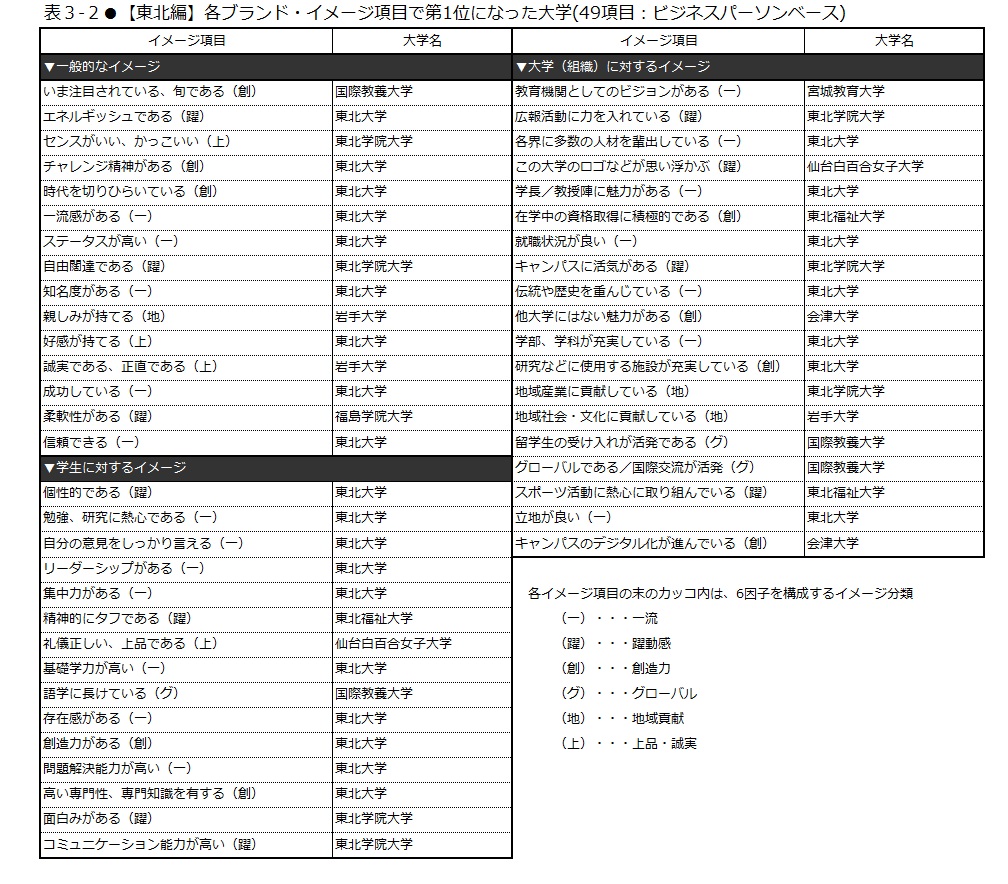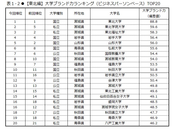 東北地方の38校における「大学ブランド力」第1位は、88.8ポイントを獲得した東北大学(表1-2)。次いで第2位は東北学院大学(59.6ポイント)、東北福祉大学(58.3ポイント)だった。上昇率第1位は岩手県立大学で、2.7ポイント伸ばした(表2)。