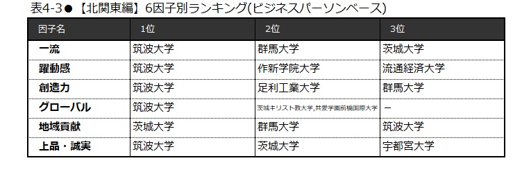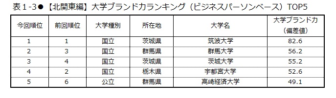 北関東の20校における「大学ブランド力」第1位は、82.6ポイントを獲得した筑波大学(表1-3)。次いで、群馬大学(56.2ポイント)、茨城大学(55.2ポイント)と続く。上昇率第1位は群馬大学で、1.9ポイント伸ばした(表2)。