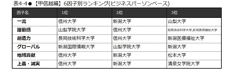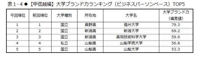 甲信越の22校における「大学ブランド力」第1位は、79.3ポイントを獲得した信州大学(表1-4)。次いで、新潟大学(69.2ポイント)、長岡技術科学大学(59.6ポイント)と続く。上昇率第1位は信州大学で、4.0ポイント伸ばした(表2)。