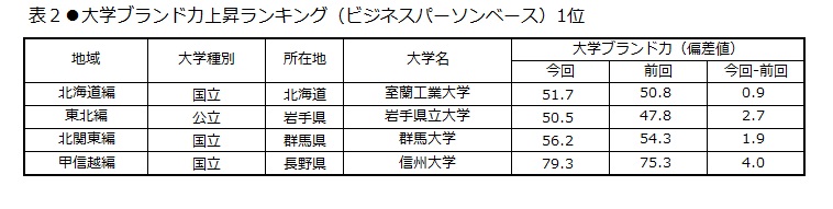 - ・前回からの上昇率では、[北海道]室蘭工業大学、[東北]岩手県立大学、[北関東]群馬大学、[甲信越]信州大学