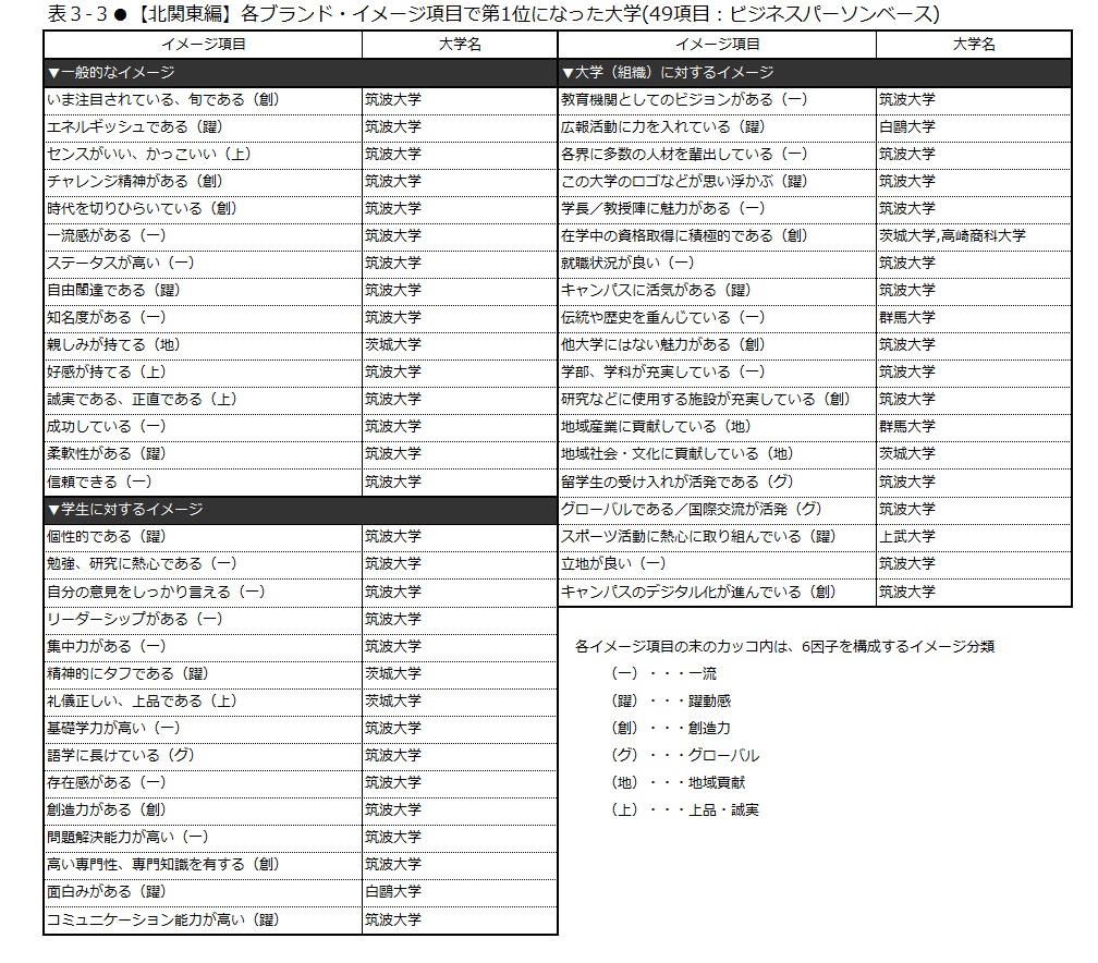 白鴎大学も、「北関東編」単独の調査を開始してから7年連続、この項目で第1位を獲得している。自由意見からは、同大学の教員のテレビ出演や、体育会系クラブなどの活躍が述べられた。加えて、東京ヤクルトスワローズのオフィシャルスポンサーであることも、神宮球場に広告が掲出されているため、同大学のことを見聞きする機会が相対的に多く、このイメージの高評価に繋がっていると考えられる。
