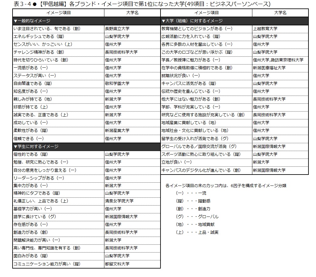 大学に関する49項目のイメージについて、それぞれの大学の得票率を見ると、各大学特有の魅力が見えてくる(表3-1~4)。「いま注目されている、旬である」では、国際教養大学(東北編)、長野県立大学(甲信越編)がそれぞれトップを獲得した。