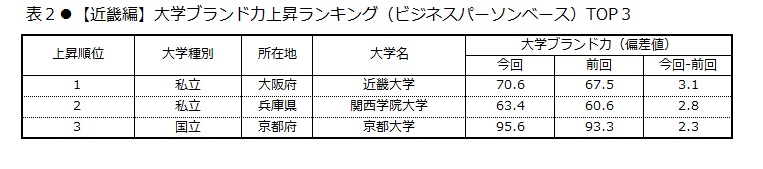 前回と比較すると、大学ブランド力上昇第1位は近畿大学で3.1ポイント伸ばした(表2)。第2位の関西学院大学は2.8ポイント、第3位は京都大学で2.3ポイント伸ばした。