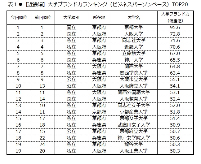 近畿地方の主要大学66校における「大学ブランド力」第1位は、95.6ポイントを獲得した京都大学(表1)。第2位は大阪大学(72.8ポイント)、第3位には同志社大学(71.6ポイント)が続いた。