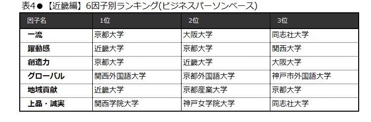 49項目のイメージを因子分析(※1)によって、関連性の高いイメージ群を6つの因子にグループ分けした(表4)。「躍動感(※2)」「地域貢献」因子のトップは近畿大学。2因子がトップとなる私立大学は、全9地域のうち、近畿大学のみだった。それぞれの因子を構成するイメージ項目のうち、「躍動感」因子では11項目中6項目、「地域貢献」因子では3項目中1項目で第1位を獲得した(なお、第1位を獲得しなかった項目も上位にランクインした)。