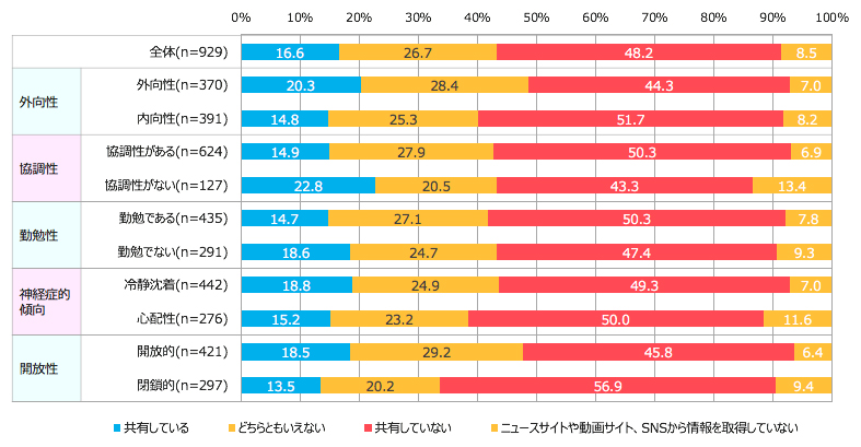 ニュースサイト/動画サイト/SNSから取得した情報の共有に関して、「協調性のない」人が情報を共有している比率が最も高い。一方、「閉鎖的」な人は、情報の共有をしていない人の比率が最も高い(図2)。