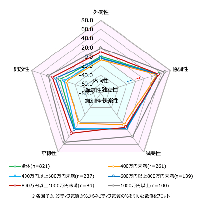 ハイパフォーマー(高役職・高所得)はポジティブなパーソナリティが高く、年収400万円未満・一般社員はネガティブなパーソナリティが高い。
