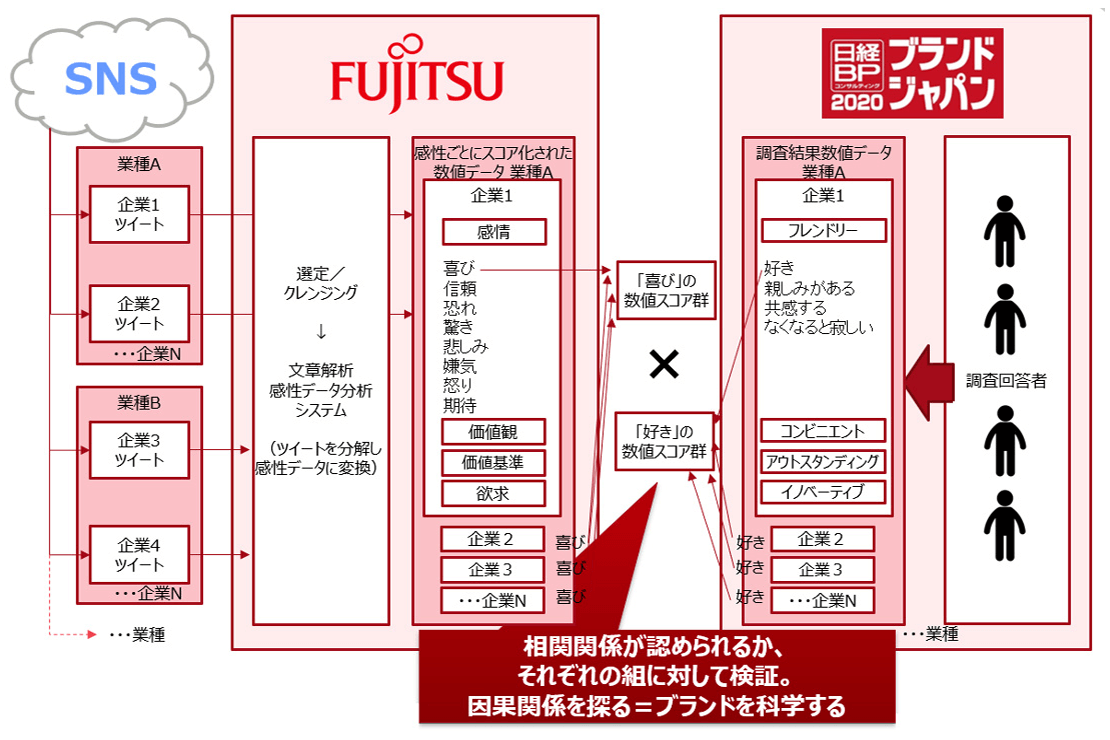 日経BPコンサルティングが実施・運営する日本最大規模のブランド力評価調査プロジェクト「ブランド・ジャパン」の調査結果に対して、富士通が収集するソーシャル・リスニング情報を基に、独自に感性データ分析したものを掛け合わせ、ブランド力の変化を、定量的・定性的の双方で、分析できるようにするための共同研究である。