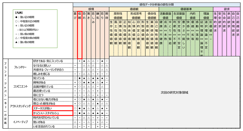 ブランド・ジャパンと感性データ分析結果の2種類のデータの相関係数を取った結果が下記である。相関の強さは凡例にある通りである。