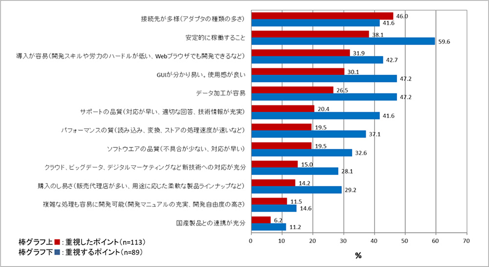 一方、導入検討中企業が重視するのは「安定的に稼働すること」で59.6%(前回57.0%)で他の項目よりも圧倒的に高い比率で、最重視項目は前回と同じ結果だった。検討中企業が次に重視するのは、「GUIが分かり易い、使用感が良い」と「データ加工が容易」で、いずれも47.2%だった。