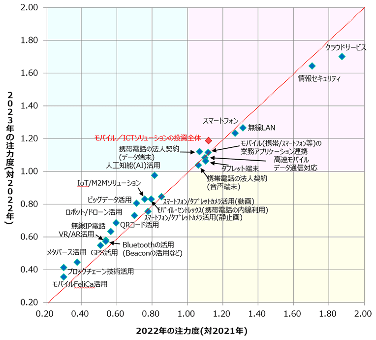 ■ 投資の注力度の回答に重み付け(「拡大」3ポイント、「横ばい」1ポイント、「縮小」マイナス3ポイント)した合計値を有効回答数(無回答を除外)で除した値。注力度指数が1の場合、前年との投資が同じということを示す。1より大きい場合、投資拡大傾向、1より小さい場合、投資縮小傾向となる。ピンクとブルーのセルにある項目は、前年よりも投資が拡大。特にピンクのセルは2年続けて前年より投資が拡大。また赤い斜線より上に位置する場合、前年よりも投資幅が拡大していることを示す。