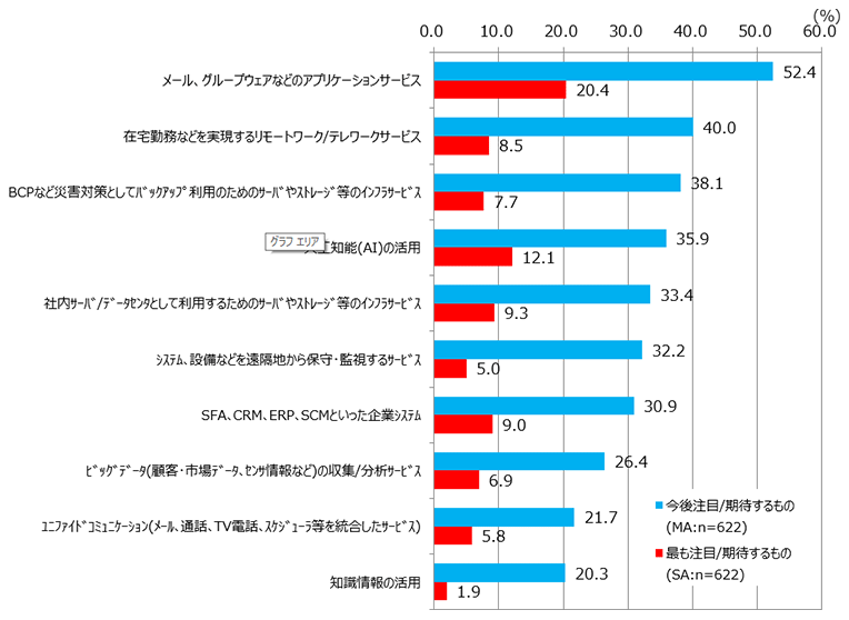 「最も注目/期待するもの」としても、「メールやグループウェアなどのアプリケーションサービス」が最も高く、20.4%が選択している。次いで、「人工知能(AI)の活用」が、12.1%の選択率でとなっている。新規技術分野では、AIに対する注目/期待が高くなっており、現時点の投資としては低いものの、将来的な投資の拡大が期待できる。
