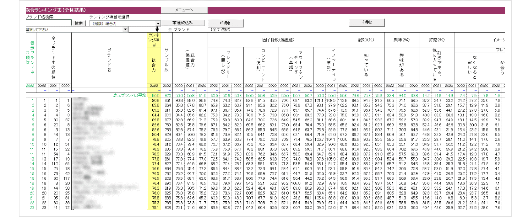 このデータを使いながら、自社・他社のデータを詳しく分析していくのがブランド・ジャパンの醍醐味。