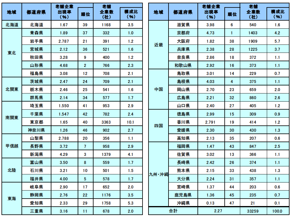 都道府県別にみると、社数では東京都(3363社)がトップ。老舗企業出現率が最も高かったのは「京都府」の4.73%。京都府は伝統工芸を守り育てる土壌があり、呉服を扱う企業や寺社仏閣の改築を手がける老舗企業の存続に大きく寄与した。次いで「山形県」(4.68%)、「新潟県」(4.29%)、「島根県」(4.03%)などの「酒どころ」が上位に入った。