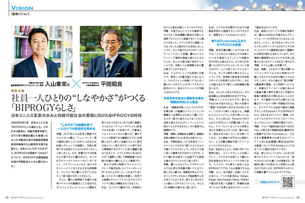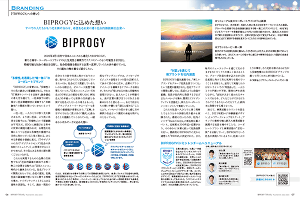 - これまではテクノロジーを想起させる直線的なデザインが多かったのですが、今回からは特集タイトルにもある“しなやかさ”を表現する形へと刷新。また、新社名決定に向けて紡がれた同社のブランディング戦略の軌跡を紹介する目玉コンテンツも掲載し、BIPROGYが次の時代に向けて着実に歩みを進めている姿を描き出しました。