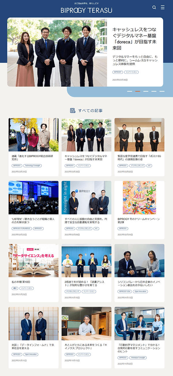 - BIPROGYは、2022年4月に日本ユニシスから社名変更を果たし、同社Webメディアも「Club Unisys(CU)」から新たに「BIPROGY TERASU」へとリニューアル。「Yearbook」も企業ブランド刷新後、初の発刊という機会を捉え、全面的なデザインリニューアルを図ると共に、社名変更の舞台裏を紹介する記念碑的コンテンツの掲出を提案しました。